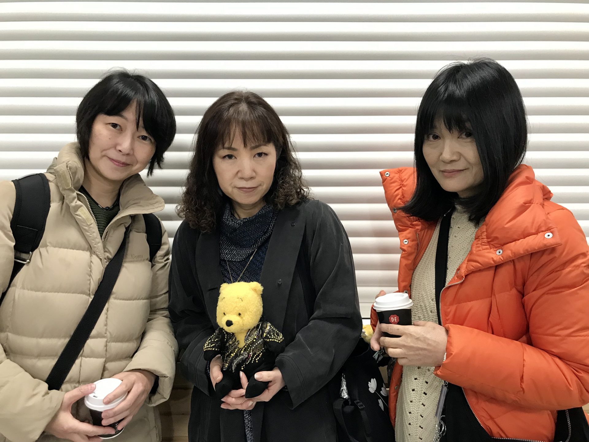 - Japanilaisfanit Yukie Hoisshi (vas.), Chiharu Detohashi ja Atsuko Yamamoto odottavat pian näkevänsä Yuzuru Hanyun jäällä miesten harjoituksissa.